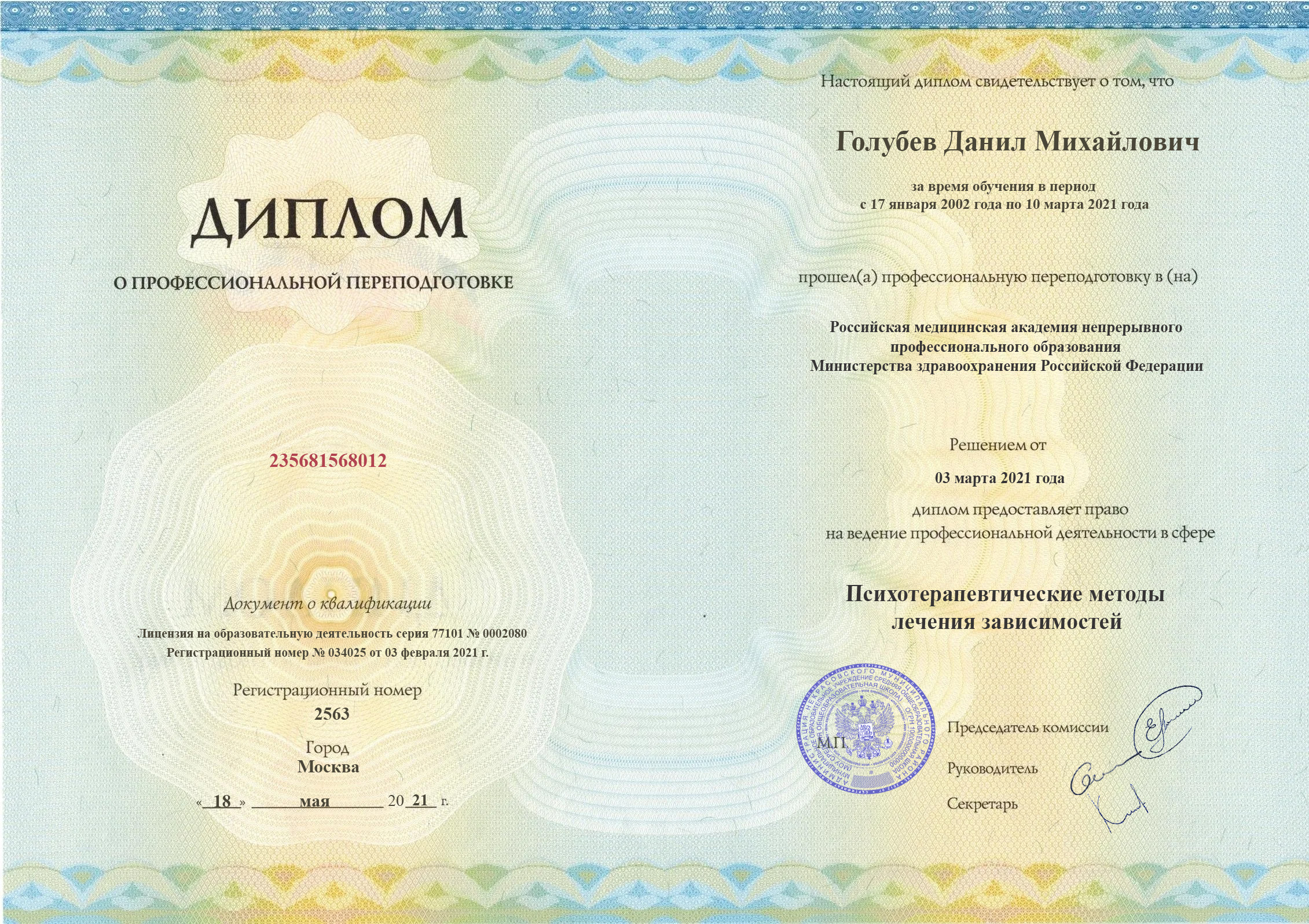 Голубев Данил Михайлович — молодой и амбициозный аддиктолог, специализирующийся на лечении зависимостей. Окончил Российский университет дружбы народов в 2018 году по специальности «Лечебное дело». В 2019 году прошел специализацию по аддиктологии, а в 2021 году — переподготовку по психотерапевтическим методам лечения зависимостей.