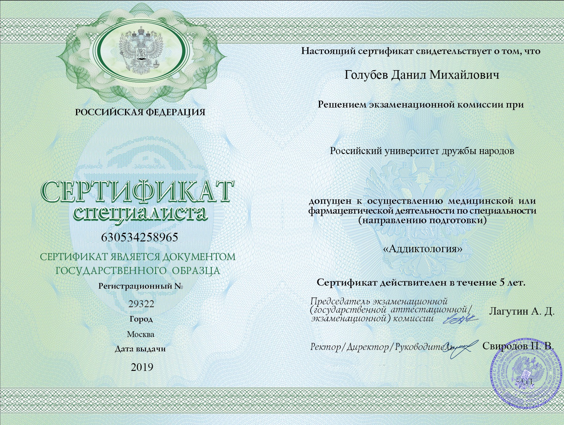 Сертификат специалиста Голубева Данила Михайловича